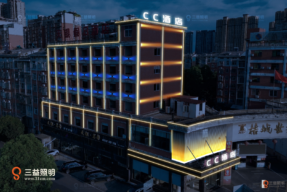 益陽市銀座商務(wù)酒店外墻燈光設(shè)計項目,本項目采用LED發(fā)光字,LED線條燈,LED十字星燈等燈具,對外墻進(jìn)行亮化。
