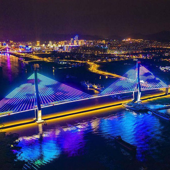 橋梁全彩LED燈光是通過安裝帶DMX512控制芯片的燈具,再通過電腦、控制器進行編程,使燈光能按程序展現(xiàn)不同效果,常用效果有炫彩、跑馬、漸變、像素屏。應(yīng)用場景:橋梁亮化工···